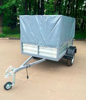 Тент для прицепа Славич 203 высокий (Русич 203) изготавливается из двухстороннего ПВХ материала плотностью 600-650 г/м2. Сзади предусмотрен клапан для открывания, позволяющий безопасно производить погрузку товара. По нижнему краю полотна расположены металлические люверсы, через которые пропускается веревка.
